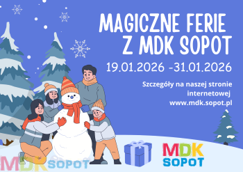 Młodzieżowy Dom Kultury w Sopocie zaprasza dzieci i młodzież na dwutygodniowe zajęcia feryjne, które odbędą się w terminie od 19 do 31 stycznia 2026 roku.